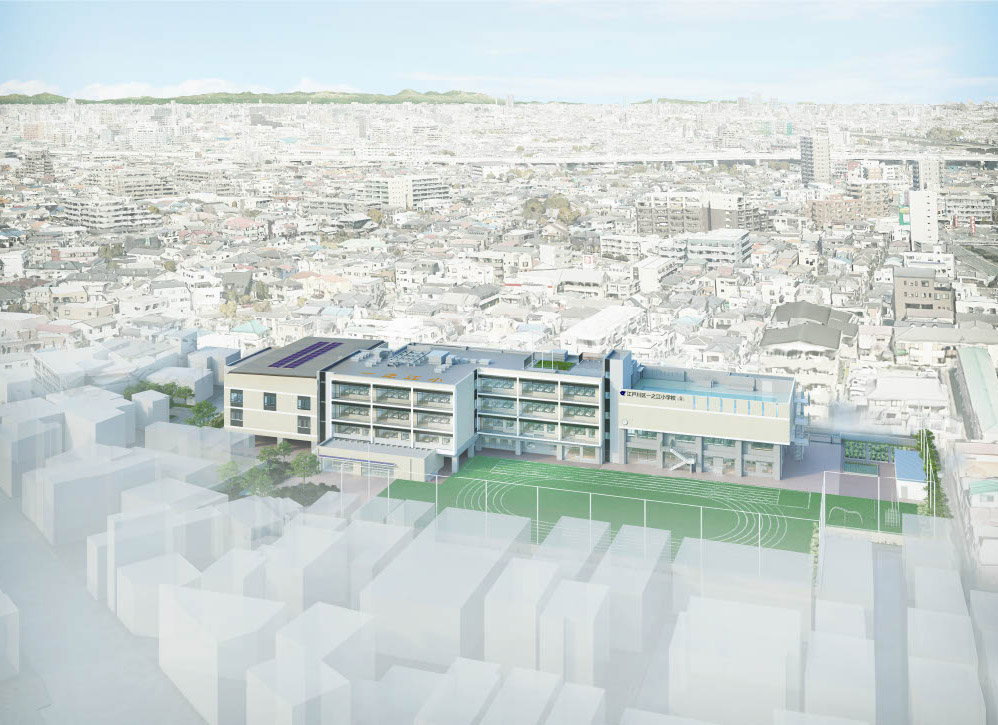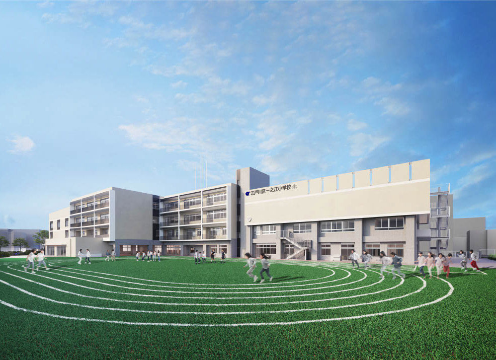東京都江戸川区にある一之江小学校の建て替え計画である。令和5年で創立70年を迎えた歴史と伝統ある一之江小学校は自然豊かな閑静な住宅地に立地し、地域とつながりも深い。新たな小学校は3つの設計方針(①学校全体にワクワクが連続する学びの場・②地域と学校が共に成長する共育の場・③都会に残る豊かな自然を生かした多様な体験の場)のもと、大きく変化する現代社会に対応し、一人ひとりの個性に応じた新たな学びに適した学習・生活空間づくりを行った。