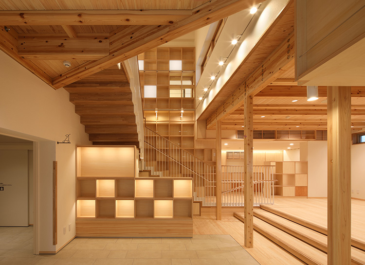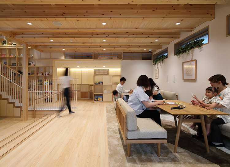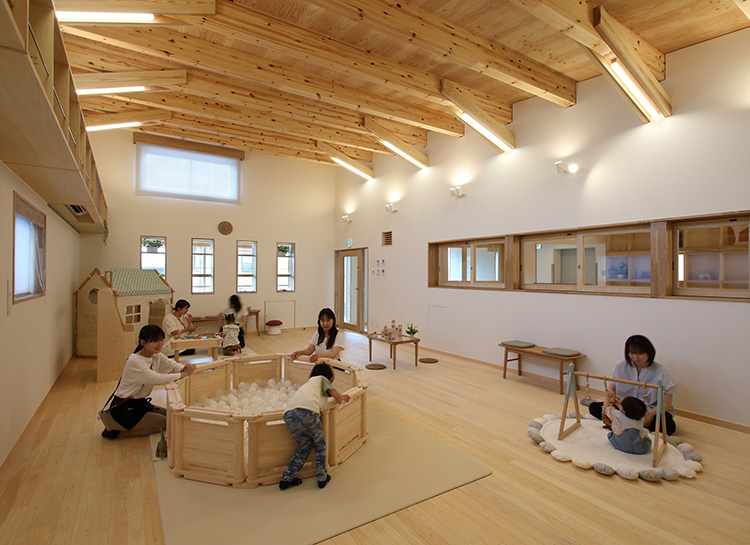 「親子が安心して集い、子育てを語り合える場所をつくりたい」という想いから生まれた、保育専門スタッフが常駐し、就学前親子を対象とする子育て支援施設。立花愛の園幼稚園の隣に建ち、明るく開放的なファサード、インテリアと構造が一体となった構成、木のぬくもりを感じられる空間を計画し、『子育て世代を支えるラウンジ』の実現を目指しました。小さな子どもが安心して過ごし、保護者同士が自然と会話を交わせる安らぎの場を提供する。
