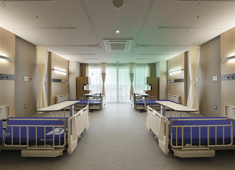 外来及び診療機能は1階に集約させ、患者動線はエントランスホールを中心に受付、外来、検査、病棟(EV)へスムーズに移動できるコンパクトでわかりやすい計画となっている。病棟のデイルームは最も環境のよい南端に計画し、高台にある敷地特性から明石海峡大橋や淡路島を望むことができる。